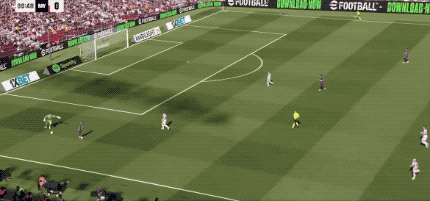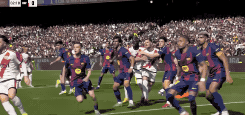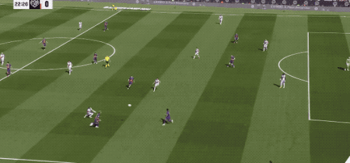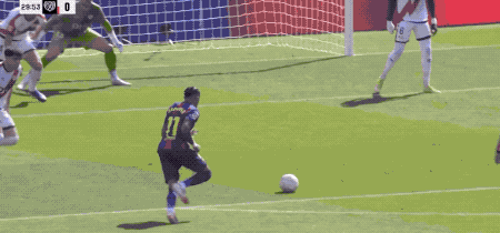 第57分钟,巴萨快发前场任意球,费兰·托雷斯第一时间将球扫到门前,球速相当快,拉菲尼亚飞铲都没能碰到皮球。