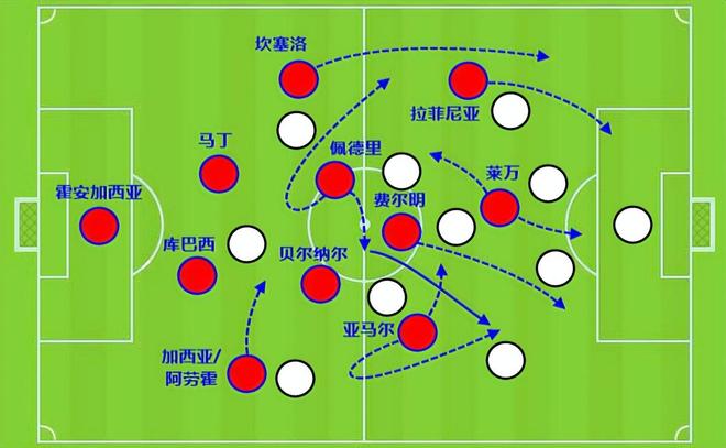 另外亚马尔发起进攻时,中间通过莱万衔接,拉菲尼亚也能更好地冲击球门。所以巴萨的中锋不只是一个射手,还要会传球和跑位(不只是门前跑位,更是接应队友完成串联)。