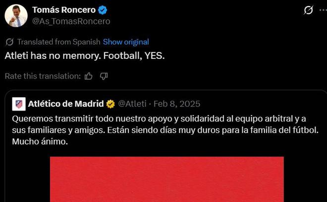 北京时间3月25日,《阿斯报》主编龙赛罗在个人社交媒体上转发了一条马德里竞技于2025年2月8日发布的支持西甲裁判的帖子,以此讽刺马竞近期在德比赛后对裁判判罚的不满。
