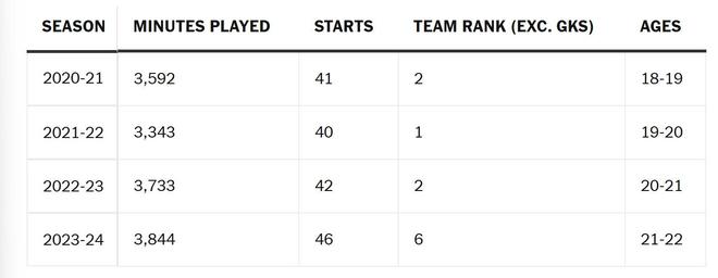 这种高负荷不仅体现在出场时间上,还体现在某些比赛中的极端消耗,这一点早在2021年就凸显出来。史密斯-罗也曾面临同样的休息困境,他因耻骨生长相关的不适而接受手术。在缺乏萨卡替补的情况下,从2021年5月到2023年10月(19岁至21岁期间),他连续出战了87场英超比赛,打破了保罗-默森保持的俱乐部纪录。