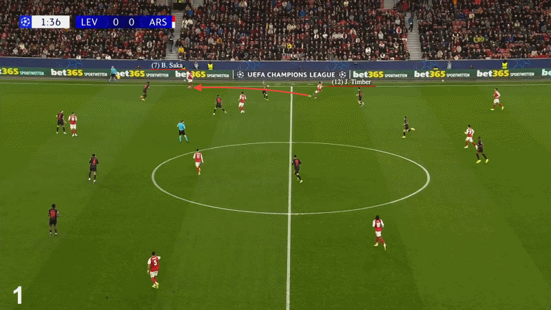 本赛季,有两种情况出现得过于频繁。第一种是萨卡在边线附近接球,周围却没有真正的传球选择,如下图所示,在对阵勒沃库森的首回合比赛中。