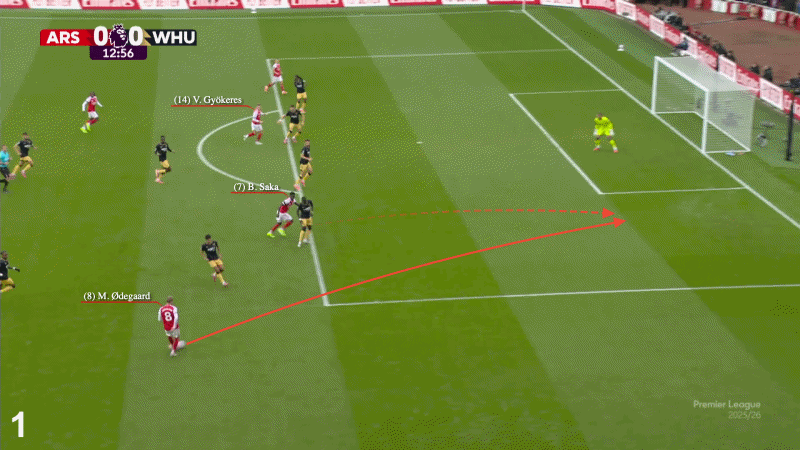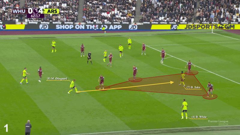 在下图所示的2024年11月战胜西汉姆联的比赛中,厄德高从纵深位置送出传球,本-怀特提供了自然的宽度,萨卡则游弋到了中路区域。他一次触球摆脱西汉姆后卫,再一脚触球完成射门。干净利落。
