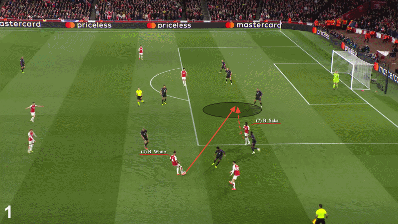 当阿森纳和萨卡处于最佳状态时,这些传球通常是从内侧传入,这样他可以在已经朝向球门移动的过程中接球。通常是怀特从更靠边的位置送出这类传球,如下图所示,在10月1-0战胜水晶宫的比赛中。