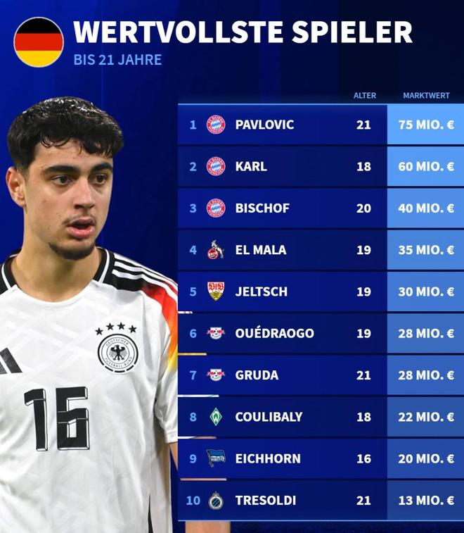 德转列德国U21球员身价TOP10:帕夫洛维奇、卡尔、比朔夫前3