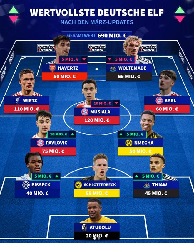北京时间3月30日,在更新了欧洲五大联赛球员的身价之后,德转列出了德国球员最贵11人阵容,身价1.2亿欧元的穆西亚拉和1.1亿欧元的维尔茨领衔。