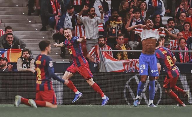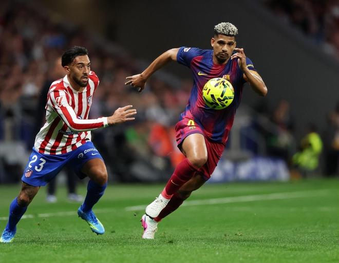 下半场易边再战才46秒时间,赫拉德-马丁防守时候一脚踩在了阿尔马达的脚踝上,主裁判没有犹豫直接出示红牌,但在VAR介入之后,主裁判又取消了红牌,改判为黄牌;不满判罚的穆索吃到黄牌,马竞助教抗议也被红牌罚下。第59分钟,亚马尔强行突破扛开朗格莱防守内切兜射偏出了球门;第65分钟,孔德右路直传,埃里克-加西亚顺势传中,费兰-托雷斯后点捅射,穆索飞身精彩扑救。