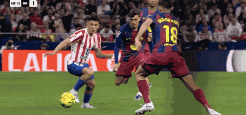 VAR介入,裁判取消黄牌,改判红牌,尼科·冈萨雷斯再遭打击。半场结束,虽然两队战成1-1平,但接下来的45分钟,马竞只能10人作战了。