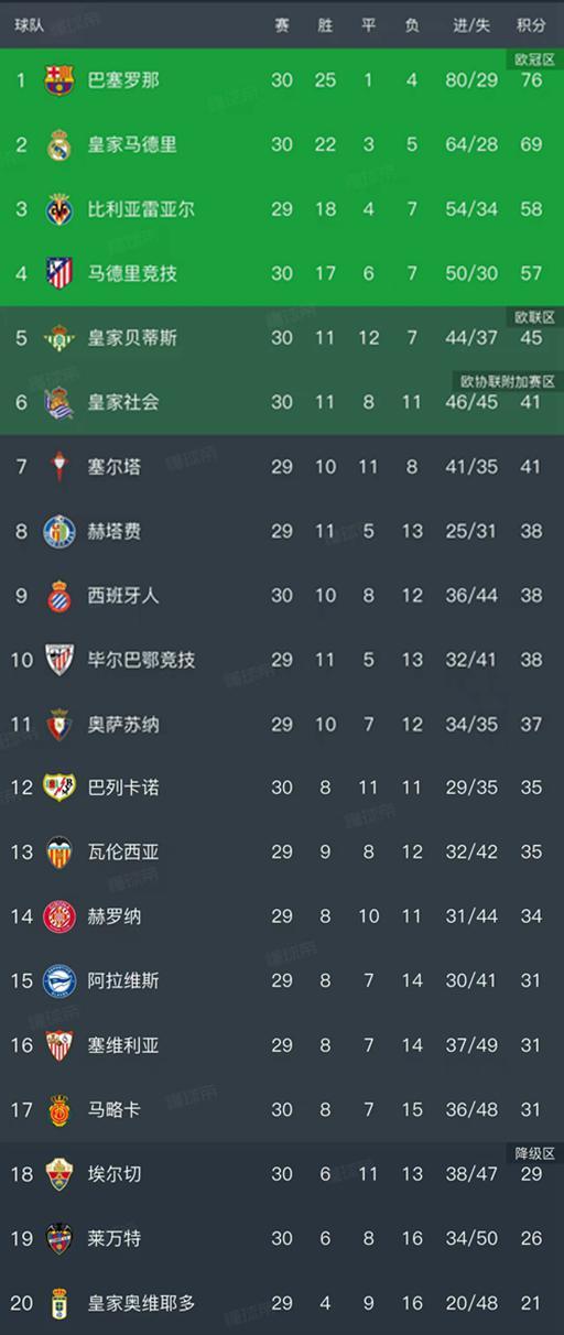西甲最新积分榜
