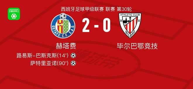 北京时间4月5日西班牙足球甲级联赛 联赛 第30轮,赫塔费主场对阵毕尔巴鄂竞技。赫塔费路易斯-巴斯克斯破门,萨特里亚诺破门。最终比分赫塔费 2-0 毕尔巴鄂竞技。