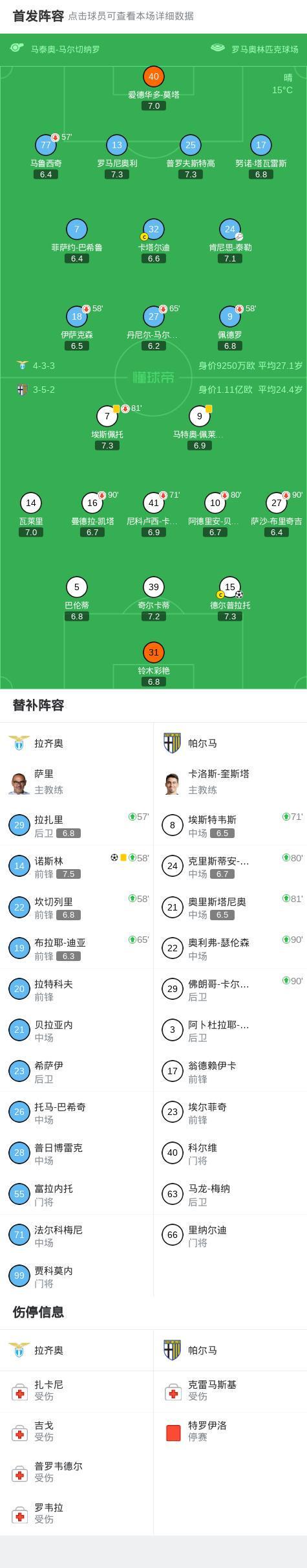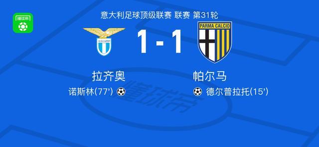 北京时间4月5日意大利足球顶级联赛 联赛 第31轮,拉齐奥主场对阵帕尔马。拉齐奥诺斯林破门。帕尔马德尔普拉托破门。最终比分拉齐奥 1-1 帕尔马。