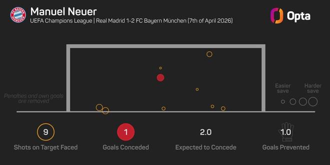 自从Opta开始进行详细数据统计以来,诺伊尔是第一位在伯纳乌球场对阵皇家马德里的欧冠淘汰赛中完成9次扑救的门将。
