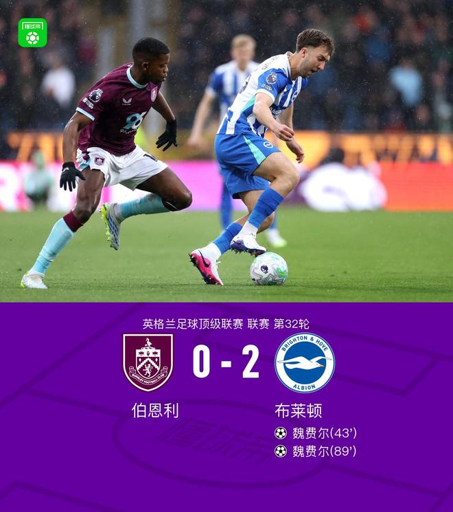 北京时间4月11日22:00,英超第32轮,伯恩利主场对阵布莱顿。上半场,杰登-安东尼进球被吹越位在先,扬库巴-明特远射被门将没收,格罗斯助攻魏费尔推射建功。下半场,汉弗莱斯越位进球被吹,魏费尔比赛尾声阶段远射破门,最终,伯恩利0-2不敌布莱顿,保级形势岌岌可危。