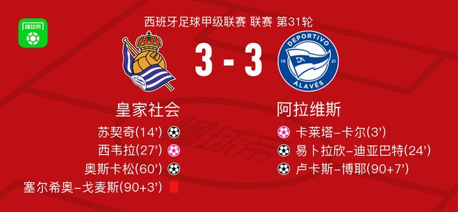 北京时间4月11日西班牙足球甲级联赛 联赛 第31轮,皇家社会主场对阵阿拉维斯。皇家社会苏契奇破门,奥斯卡松破门,卡莱塔-卡尔自摆乌龙。阿拉维斯易卜拉欣-迪亚巴特破门,卢卡斯-博耶破门,西韦拉自摆乌龙。最终比分皇家社会 3-3 阿拉维斯。