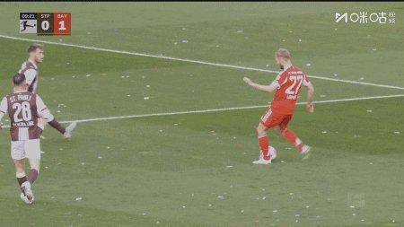第27分钟,圣保利门将出球失误,拜仁前场断球后将球给到穆西亚拉,后者稍作调整后一脚爆射击中立柱。