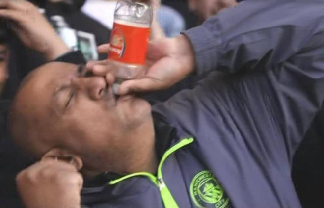 在多库为曼城将比分扩大至3-0后,看台上的一位镜头感拉满的曼城球迷拿起印有阿森纳队徽的瓶子“对瓶吹”,长时间占据了转播镜头。