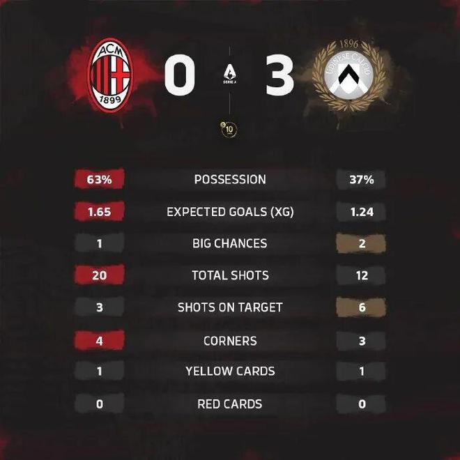 北京时间4月12日0点,意甲第32轮,米兰在出场圣西罗球场对阵乌迪内斯。上半场,阿塔小角度爆射造成巴特萨吉乌龙,戴维斯射中门框,埃克勒卡姆头球扩大比分。下半场,萨勒马科尔斯远射被扑后也击中横梁,阿塔锁定胜局。最终米兰0-3不敌乌迪内斯。