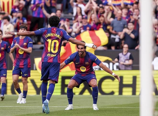 第87分钟,西班牙人中圈回传失误,亚马尔反应断球单刀赴会过掉门将推入空门锁定胜局,3:1!18岁的亚马尔2射1传独造3球,这赛季43场出场贡献了22球17助攻;同时他也成为了自1959年以来,首位19岁前在五大联赛打入29球的球员。第89分钟,德容前插下底传中,拉什福德凌空垫射将比分锁定在了4:1!