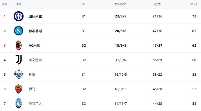 在积分榜上,国际米兰遥遥领先,以72分高居榜首,战绩是23胜3平5负。而那不勒斯以65分排名第2,落后了7分,争冠难度很大。AC米兰输球,依然是63分,排名第3。AC米兰此前是夺冠热门之一,由于近段时间频频丢分,导致争冠形势恶化,现如今争冠基本失去希望。尤文图斯以60分排名第4。第5的是科莫,拿到58分。科莫比尤文图斯少踢1场,接下来还是有希望超越尤文图斯。罗马以57分排名第6。
