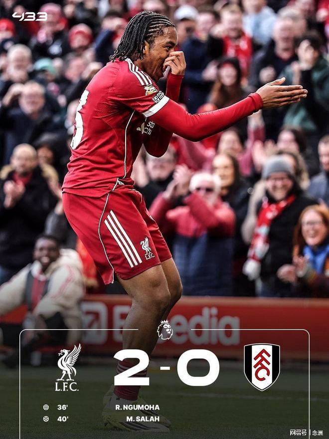 利物浦主场2-0击败富勒姆,终结各项赛事3连败,先赛领先身后的切尔西4分。恩古莫哈右脚精彩兜射破门,加克波助攻萨拉赫再下一城,柯蒂斯-琼斯内收肌受伤无奈伤退。