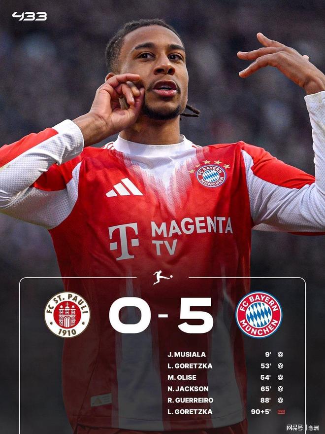 德甲第29轮,拜仁客场5-0圣保利,本赛季打进105球,打破队史联赛单赛季进球纪录,各项赛事五连胜,12分优势领跑积分榜,若下轮自己取胜而多特丢分,则提前夺冠。穆西亚拉头球破门,格雷茨卡、奥利塞再下一城,杰克逊建功,格雷罗锁定胜局。