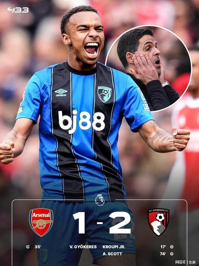 英超第32轮,阿森纳主场1-2伯恩茅斯,四连胜终结,先赛两场积70分以9分优势领跑。本怀特漏人失误,克鲁皮先拔头筹,加布里埃尔造点,哲凯赖什点射扳平+越位进球被吹,斯科特建功。