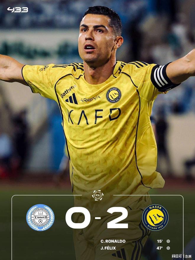 沙特联第28轮,利雅得胜利客场2-0战胜阿科多,豪取联赛14连胜,积73分继续领跑,领先第2名新月5分。C罗连场破门+生涯第968球,菲利克斯补射扩大比分。