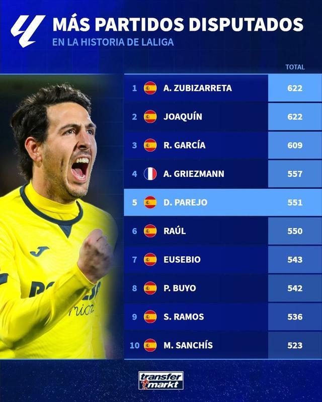 根据德转的统计,本场比赛是帕雷霍生涯至今出战的第551场西甲比赛,他也就此超越了皇马的传奇球星劳尔,成为西甲历史出场次数第五多的球员。